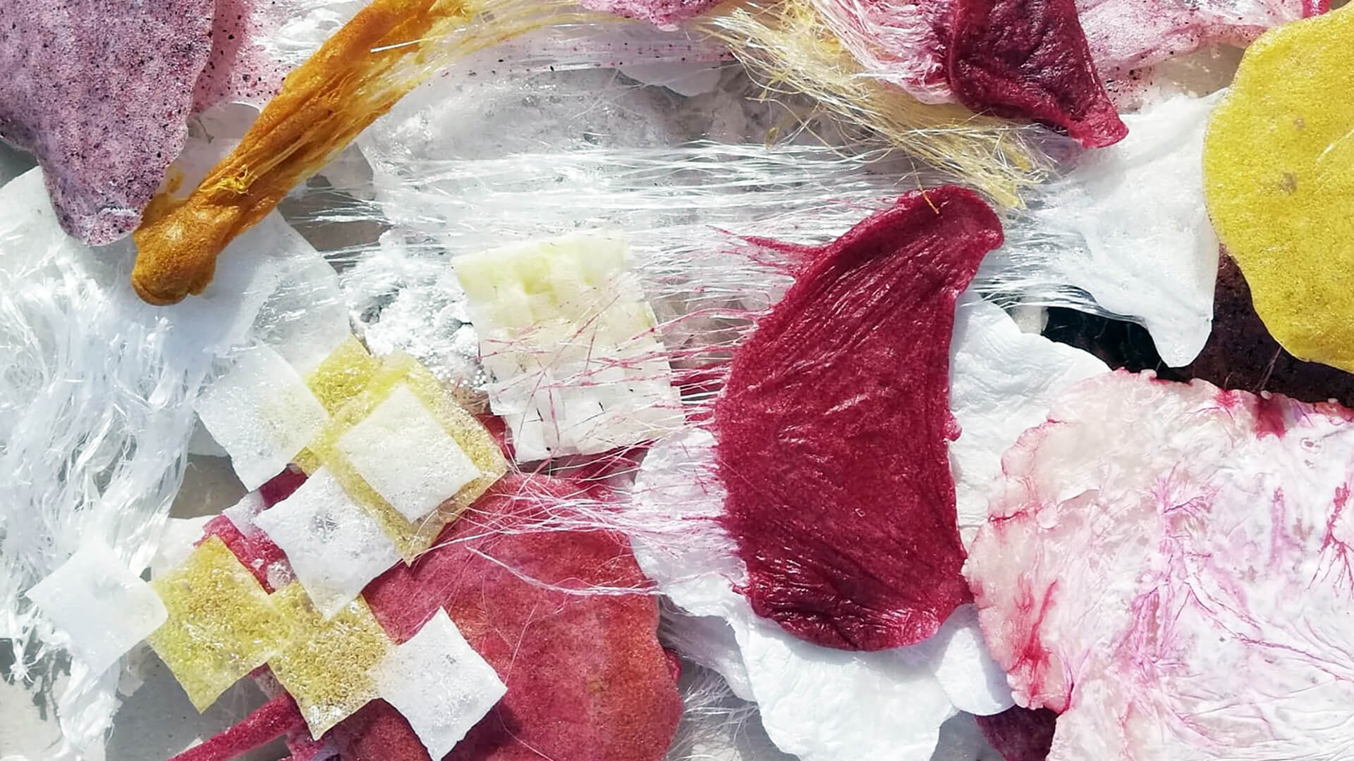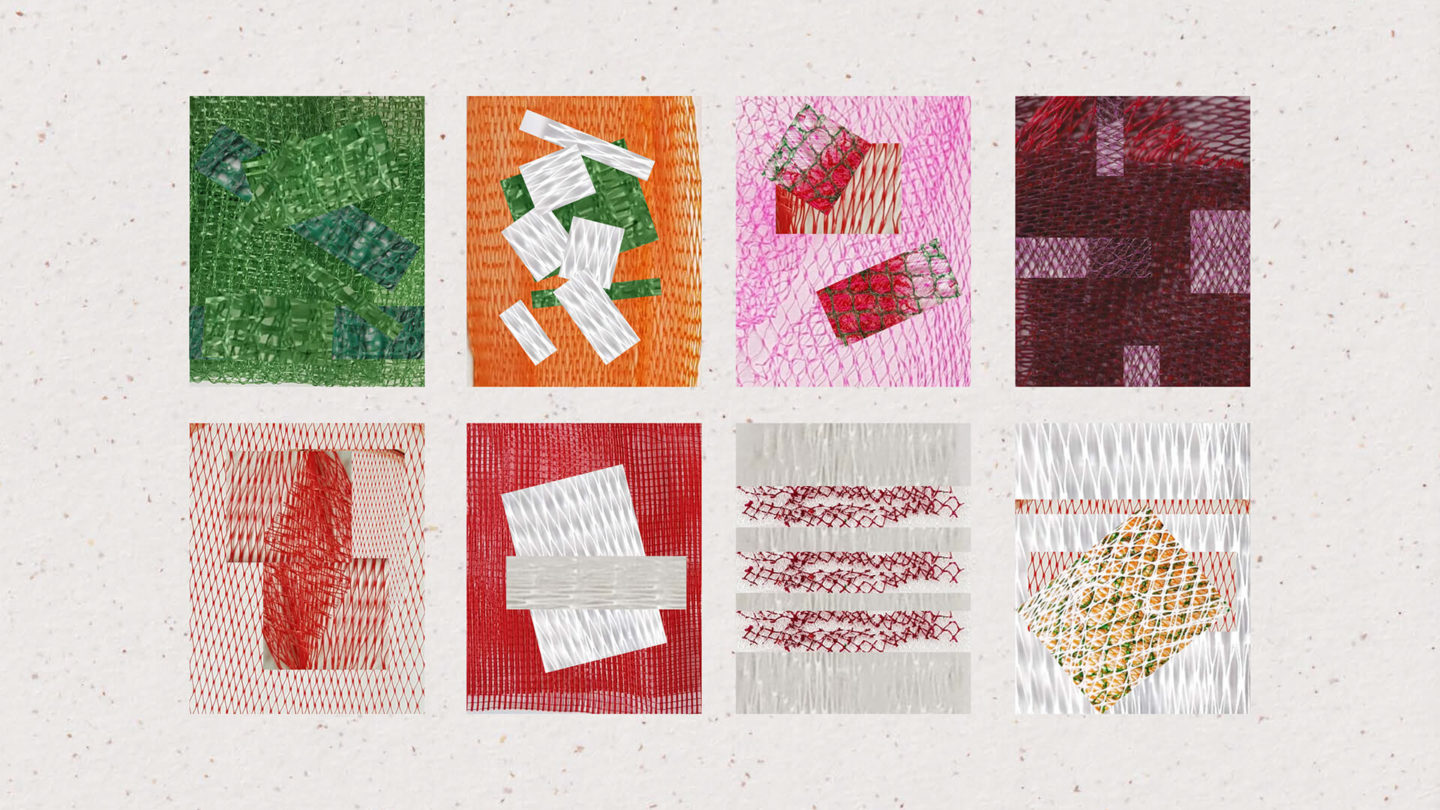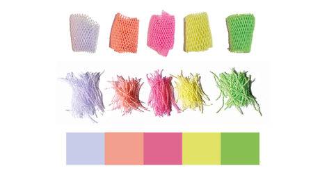 Dent used two overlooked plastics to create new materials for use in commercial hospitality and transport interiors. Polypropylene and Polyethylene nets are found in supermarket waste streams. Both are strong, lightweight and can be coated with antimicrobial properties to suit a post-pandemic world. Dent worked with the brightly coloured materials, manipulating them through plying, weaving and heat setting to create mottled effects in subtle colour palettes, whilst adding strength and longevity to the materials. The resulting textiles allow colour and light to diffuse, encouraging a closer look. The new mono-materials can still be recycled in a closed loop system.