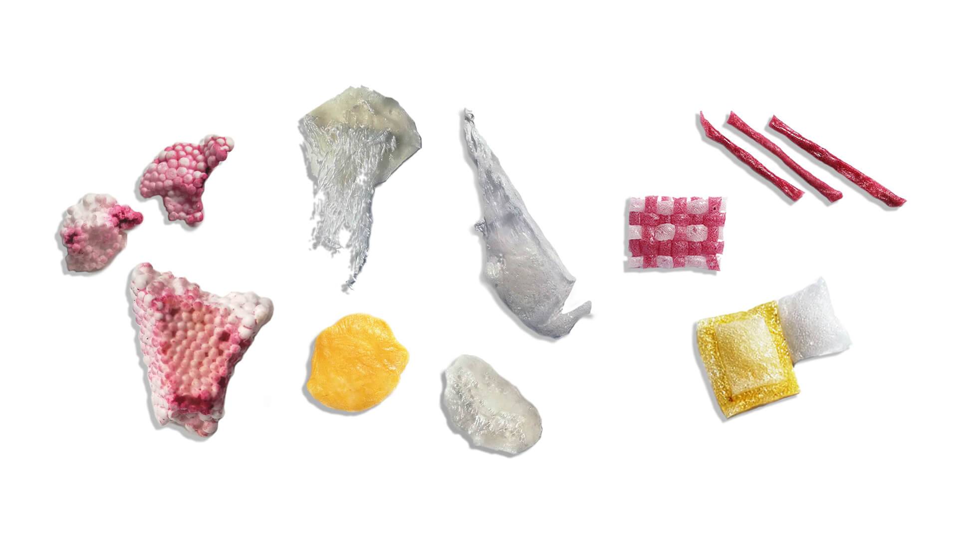 The students tackled the brief in the most difficult times with great enthusiasm and passion, addressing one of the biggest challenges of our time and creating beautifully handcrafted solutions.The CMF team loved the transformation of polystyrene into new surfaces with extended properties and the clever addition of natural colour pigments and image transfers in Bethany’s work. Henrietta’s unravelling of fruit nets provided a beautiful solution to re-weaving a mono material that then can still be recycled and Yuke’s playful approach in creating tools to educate children provided a great transformation into reuse and education. We found that they all provided very different solutions to the same problem but all very well grounded.