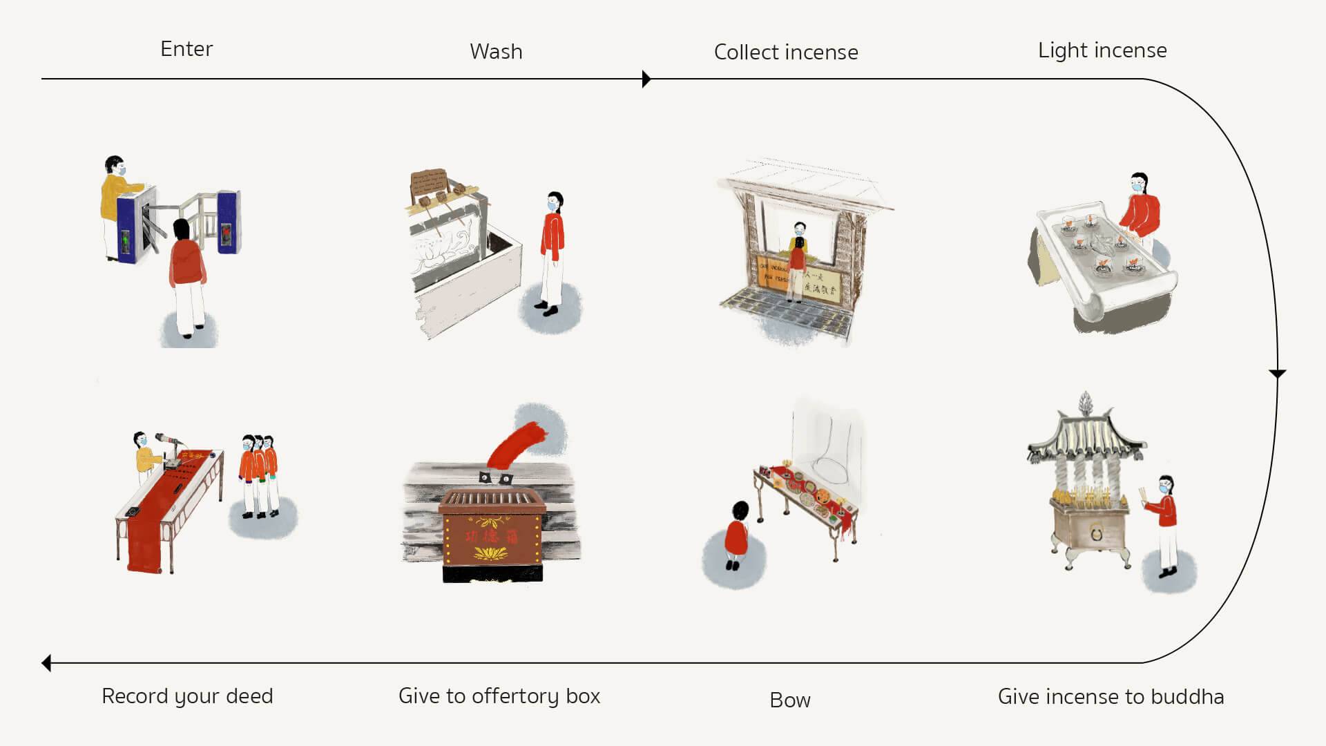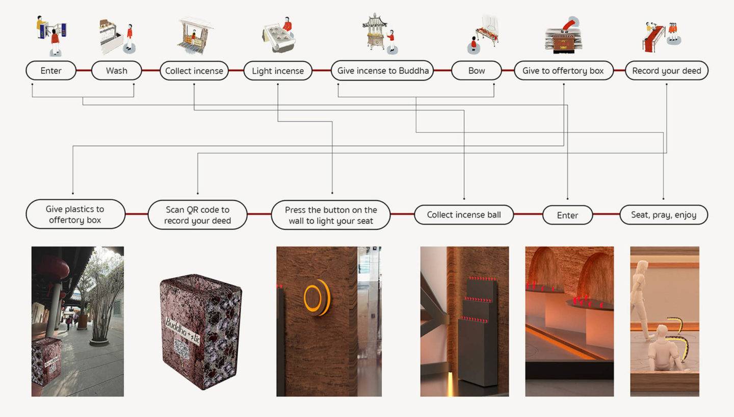 Buddha+stic is derived from the idea of community collection, looking in particular at specific events where participants are most likely to have natural incentives and shared values. Hong looked into the Buddhist community in her hometown, Fujian and collected waste generated during temple rituals. She was struck by the dichotomy of a negative impact – waste – born out of a practice filled with good intentions – religious ritual. The materials she collected were mostly the same across each site: incense packaging, red plastic bags and tea light cups. Using these materials, Hong wished to design a remote ritual that responds to a post-pandemic environment. Instead of putting money into offertory boxes, users bring the plastic waste from their ritual, recording the deed on an app, where they can also track the application of the plastic they contributed. Hong’s final design is a lotus shaped table lamp made from remoulding the collected plastics, which emits the scent of incense when being used. The Lotus shape is a common signifier in Buddhist culture that represents purity and dignity.