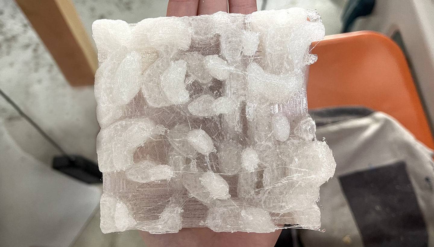 Chen used the acoustic properties of expanded polystyrene as her starting point. Exploring the sounds of nature and the sounds of the city as her creative inspiration, she designed a distinct aesthetic made from recycled expanded polystyrene. Her main design method consisted of collecting sounds, analysing the data thereof and using it to generate intricate patterns. Chen explored a range of methods to transform her source material, including laser cutting, 3D printing and weaving. The resulting re-worked expanded polystyrene is suitable for a range of applications, from soundproof walls to stuffing for toys, 3D printing filament or furniture filling.