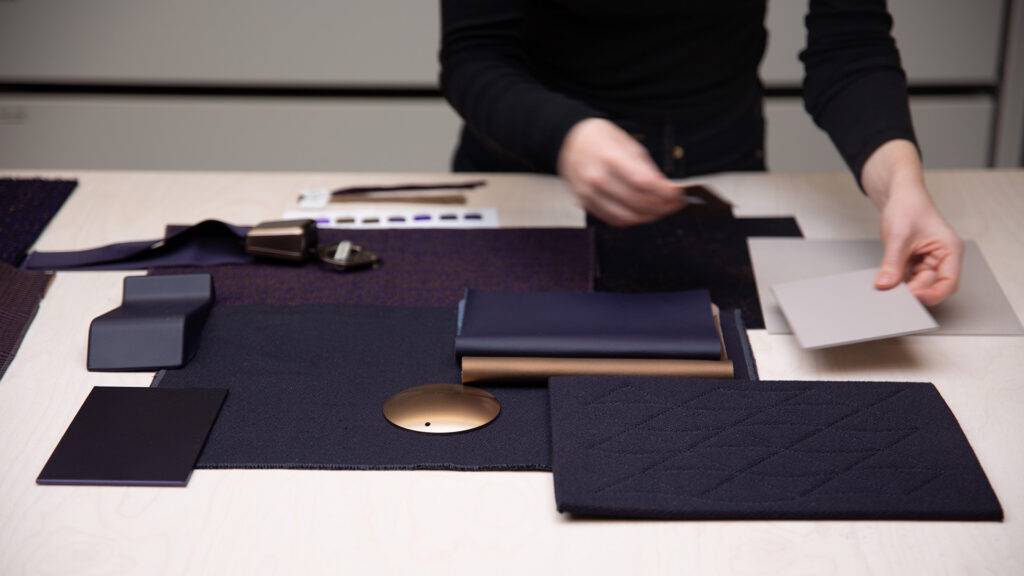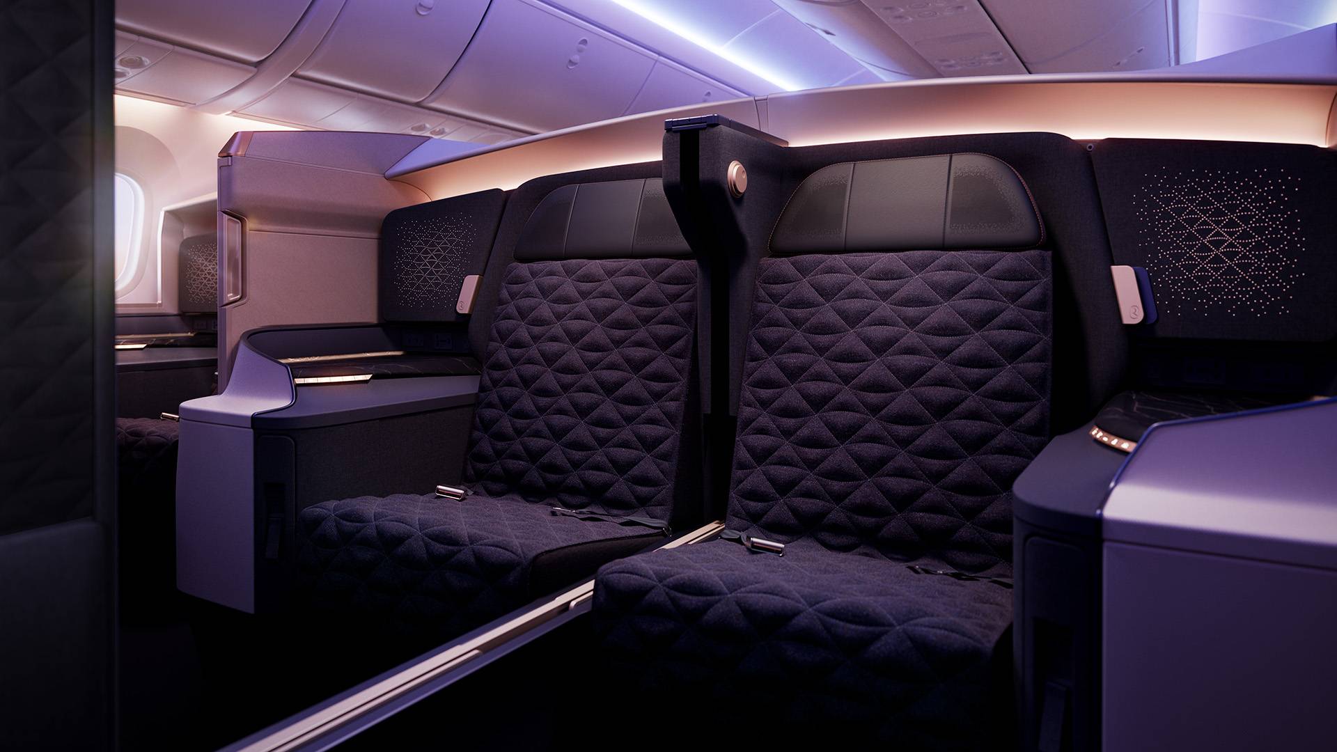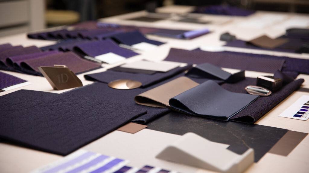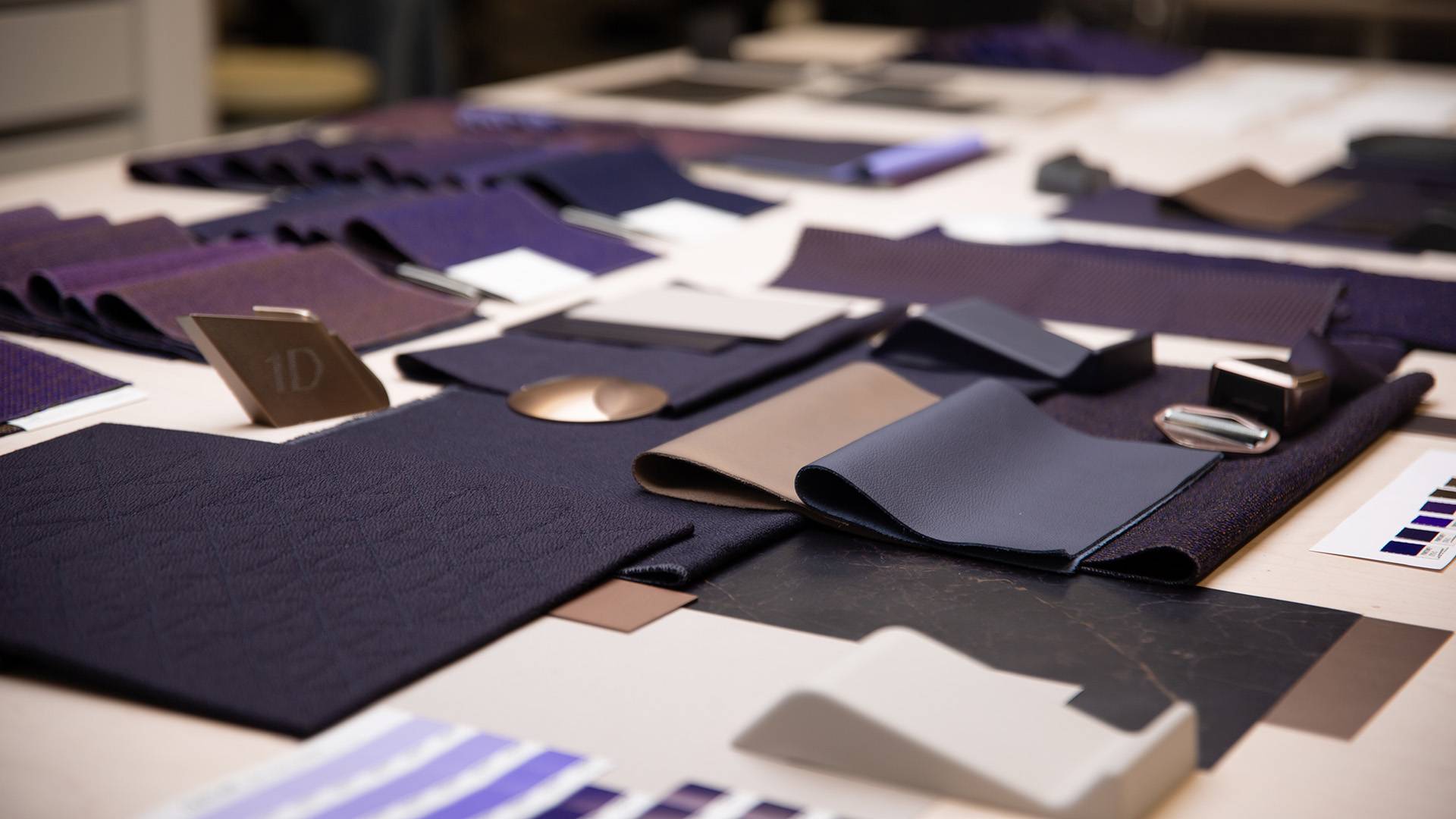 PriestmanGoode’s Colour, Material and Finish (CMF) team developed a custom fabric with Rohi for the Economy dress cover featuring a distinctive flip design, incorporating pink and purple threads that change shades depending on the angle of view. The Rohi textile was woven with an indigo base and peach and lavender threads to create a subtle iridescent effect that resonates with the brand livery, adding an elevated tactile and visual experience.