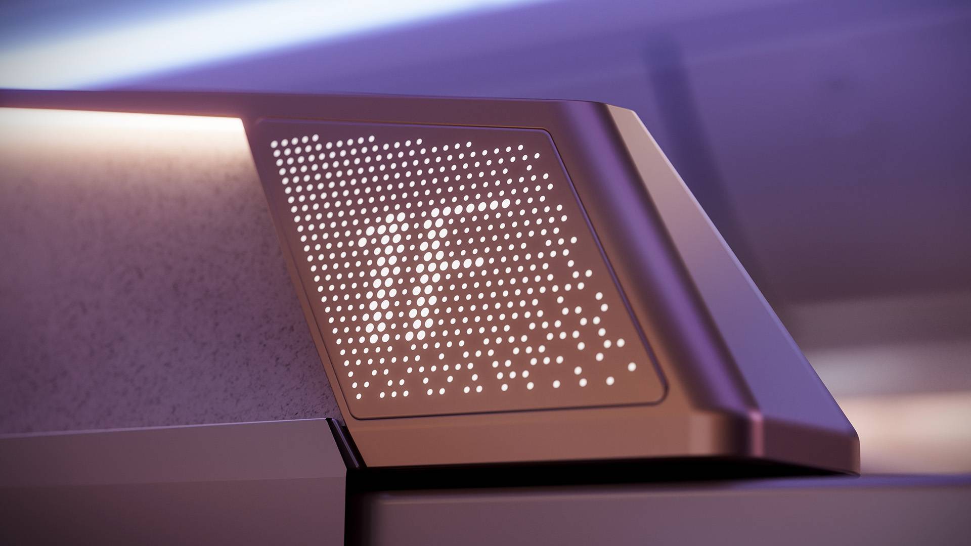Most materials were custom-designed, with a unique pearlescent paint on the canopy that reflects light. Developed in collaboration with Mankiewicz, this single-coat self-texturing pearlescent paint enhances the visual richness of the Canopy Twist while also improving maintenance and lifecycle performance.